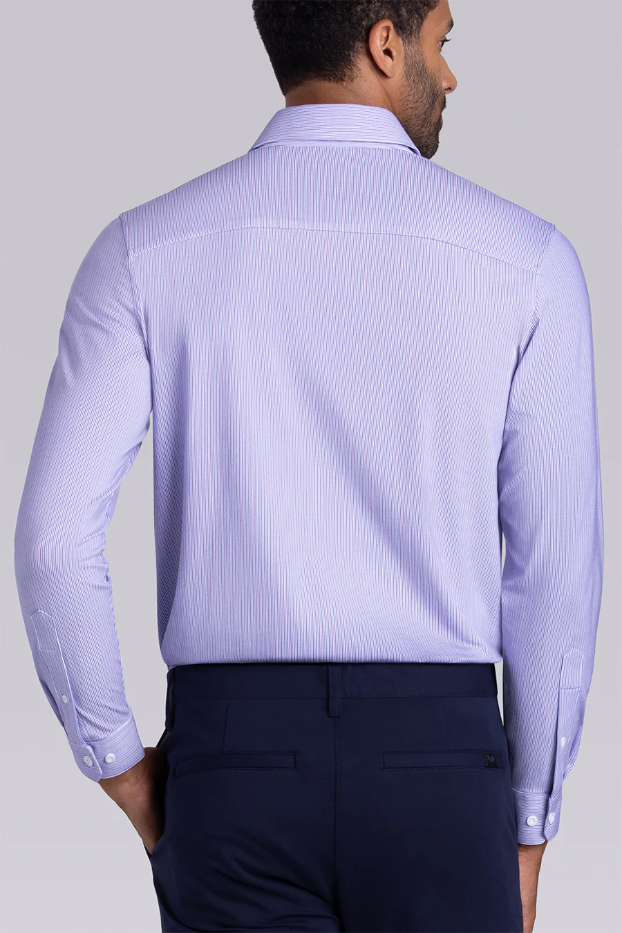 Model is 6'2" with a 40" Chest and is wearing size M, Regular fit, Light Purple/Dark Royal